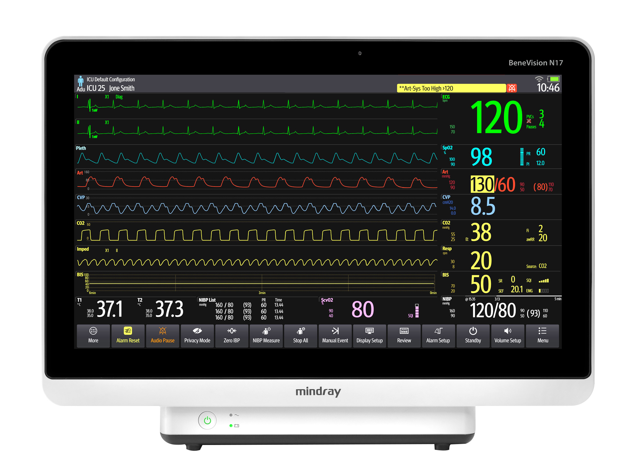 BeneVision N17 hastabaşı monitörü, geniş 17 inç FULL HD (1920 x 1080) yüksek çözünürlüğe sahip gelişmiş ekran teknolojisi ve kullanıcı ara yüzü tasarımı ile, hasta verilerinin kolayca algılanıp değerlendirilebilmesi için net, çok renkli ve geniş formatlı görüntü sunmaktadır. Multitouch özellikli dokunmatik ekran sayesinde, kullanıcılar monitörü hızlı ve kolay bir şekilde kontrol edebilir ve hasta verilerini değerlendirebilir.